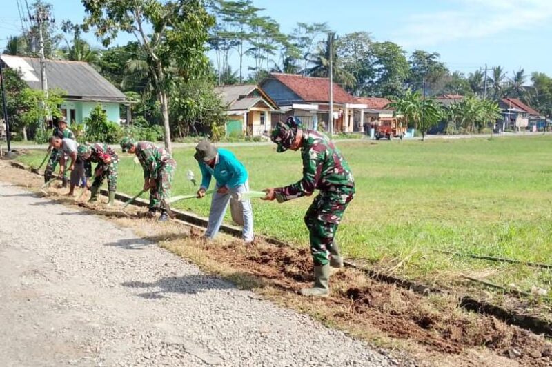 Cilacap, Tabloid Putra Pos – Menjelang pembukaan TNI Manunggal Membangun Desa (TMMD) Reguler ke-124 Kodim 0703/Cilacap, anggota Satgas bersama warga Desa Kaliwungu, Kecamatan Kedungreja, Kabupaten Cilacap, bahu-membahu membersihkan jalan di pinggir lapangan yang akan menjadi lokasi utama acara pembukaan, Rabu (30/4/2025).