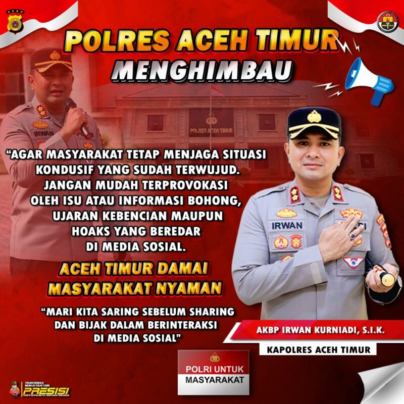 “Oleh karena itu kami minta masyarakat untuk tetap tenang dan beraktivitas seperti biasa.” Terang Kapolres Aceh Timur AKBP Irwan Kurniadi, S.I.K.