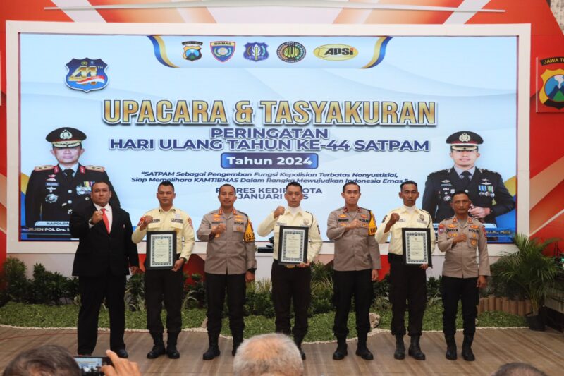 Tabloid Putra Pos | Kediri Kota – Kapolres Kediri Kota AKBP Bramastyo Priaji, berikan penghargaan kepada tiga orang Satpam berprestasi pada saat Upacara dan Tasyakuran hari Satpam ke – 44 tahun 2024 di Gedung Rupatama Polres Kediri Kota, Rabu (8/1/25)