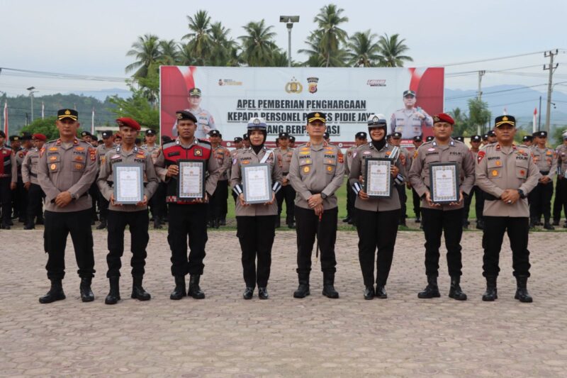 PIDIE JAYA – Polres Pidie Jaya memberikan penghargaan kepada lima personel berprestasi dalam Apel Pemberian Penghargaan Tahun 2025 yang digelar di Lapangan Mapolres, Senin pagi (4/8/2025).