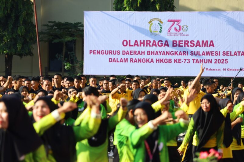 Dalam rangka memperingati Hari Kesatuan Gerak Bhayangkari (HKGB) ke-73 Tahun 2025, Bhayangkari Daerah Sulawesi Selatan bersama Bhayangkari Cabang menggelar kegiatan olahraga bersama yang berlangsung di Lapangan Apel Belakang Mapolda Sulsel, Jumat (10/10/25).