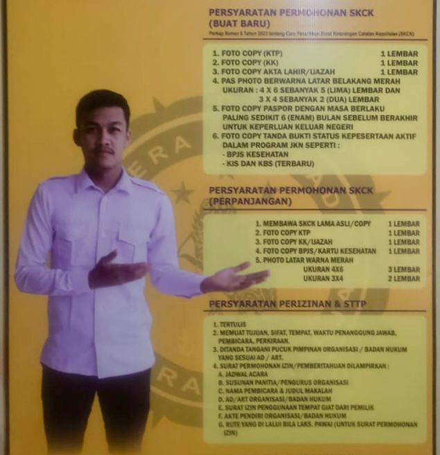 Adapun persyaratan dalam pengurusan SKCK, yaitu fotokopi KTP, Kartu Keluarga, ijazah terakhir, dan BPJS (masing-masing 1 lembar). Selain itu, dilampirkan pas foto ukuran 4×6 sebanyak 5 lembar berlatar merah serta pas foto ukuran 3×4 sebanyak 2 lembar berlatar merah.