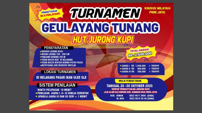 Kegiatan ini menjadi ajang bagi para penggemar layang-layang Aceh untuk menunjukkan keterampilan mereka. Pendaftaran peserta dibuka mulai 20 hingga 30 Oktober 2025, dan dapat mendaftar langsung di Warung Jurong Kupi, Jalan Ulee Glee – Kumba, dekat Pasar Ikan.